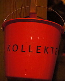 Typisch für uns ist der charakteristische rote Kollekteneimer am Ausgang.