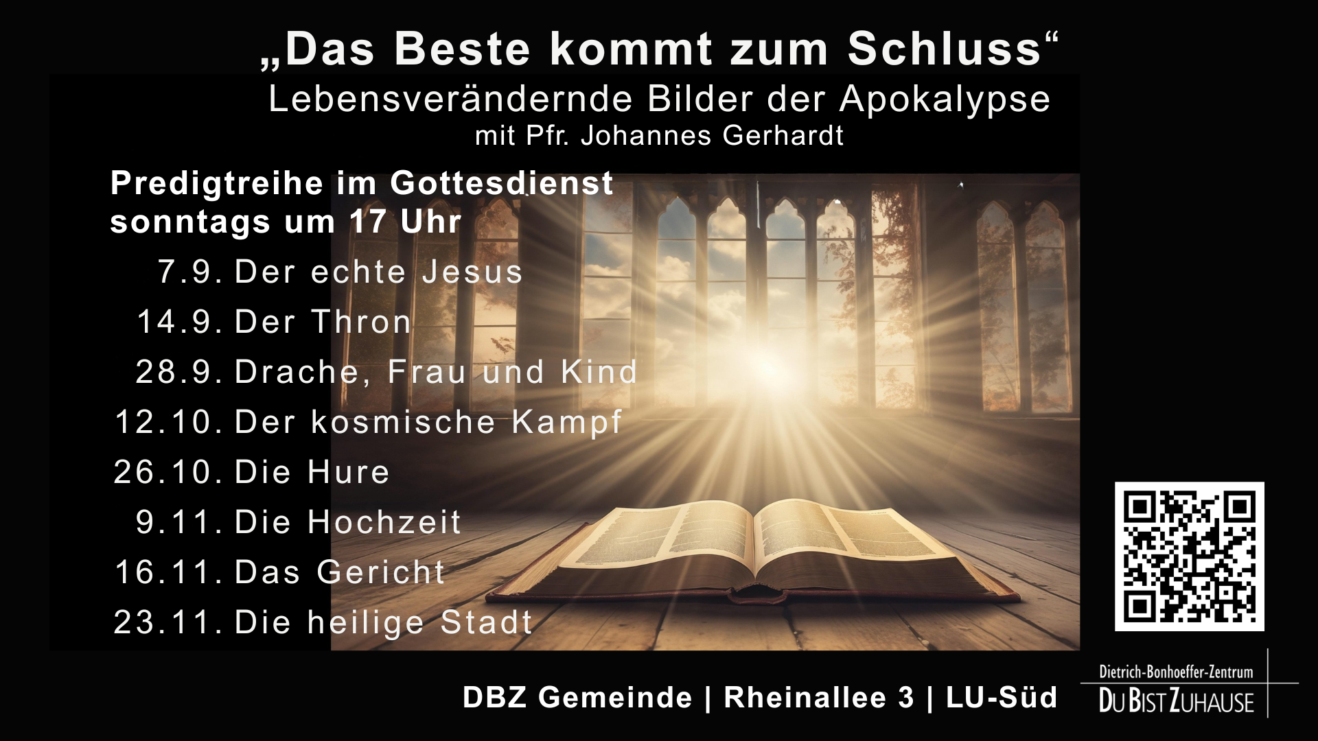 Wir wollen uns in dieser Themenreihe davon berühren lassen, was dieses geheimnisvolle Buch „offenbaren“ möchte. Gewaltige Bilder der Apokalyptik – vergleichbar mit unserem Fantasy-Genre – die eine gewaltige Wirklichkeit beschreiben. Wer lernt, sie zu verstehen, wird merken, dass die „Offenbarung“ uns heute etwas zu sagen hat: Ein stärkendes Trostbuch, mit dem Potential, das eigene Leben zu verändern!